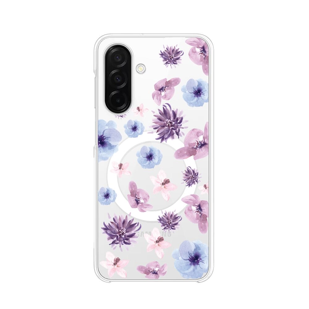 Etui do Samsung Galaxy A26 5G z MagSafe przeźroczyste, silikonowe Flexi, kwiatki niebieskie, fioletowe