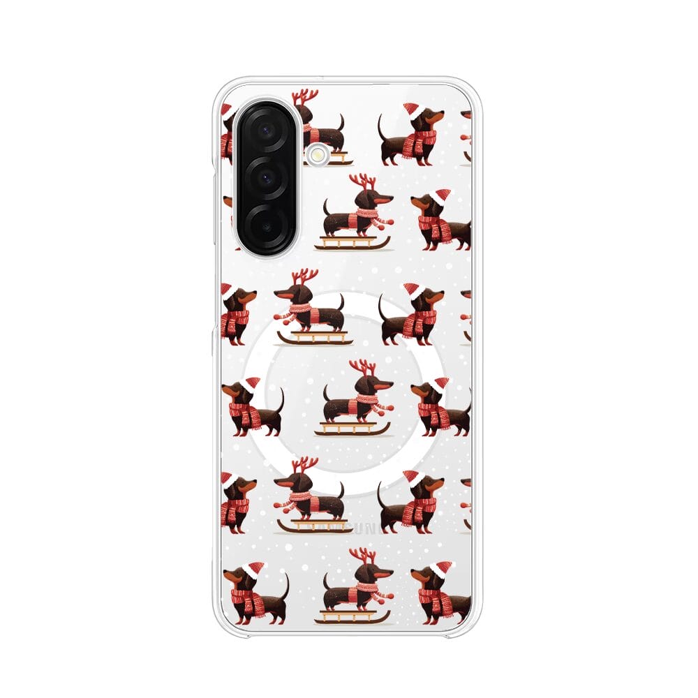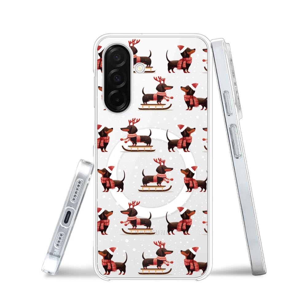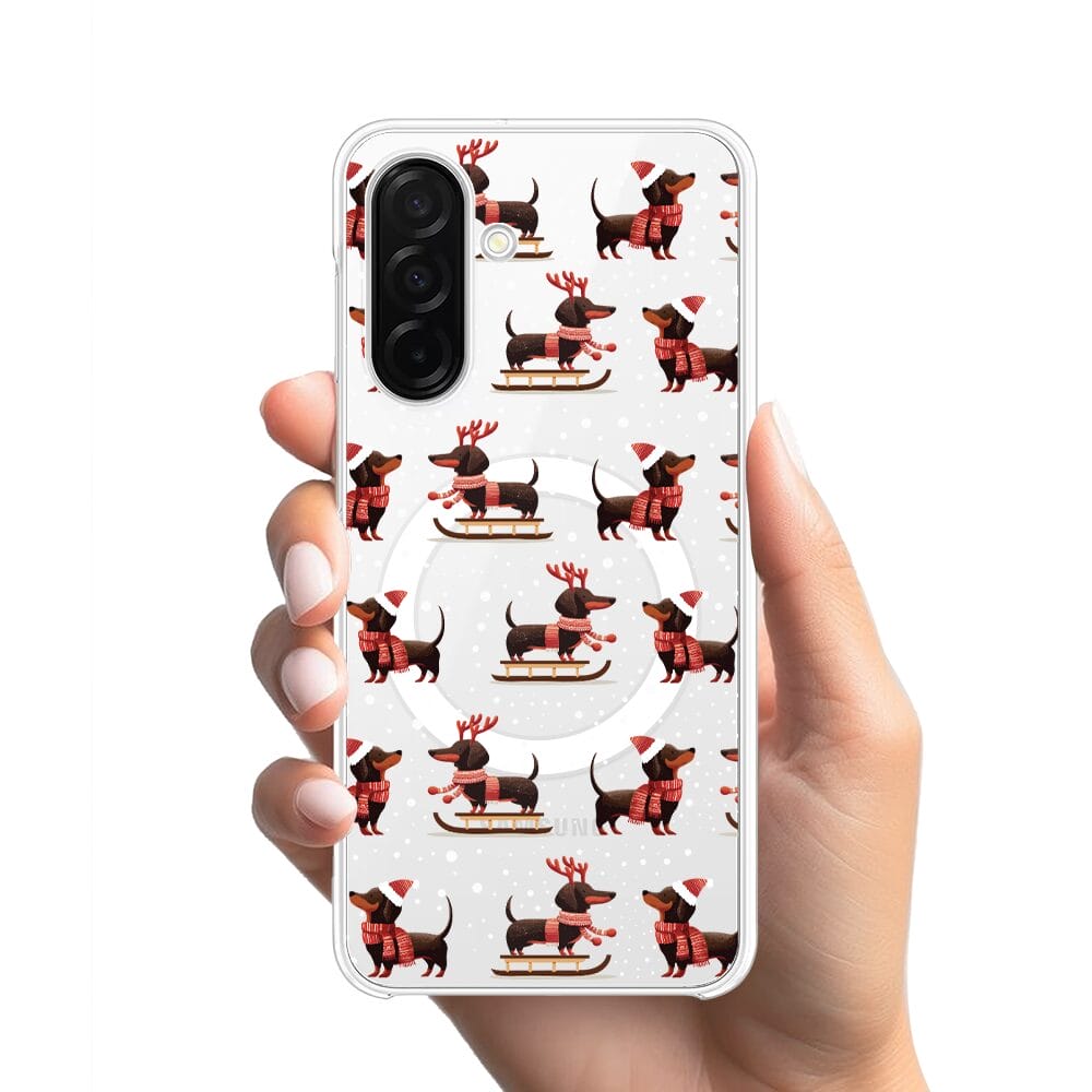 Etui do Samsung Galaxy A26 5G z MagSafe przeźroczyste, silikonowe Flexi, Przytulne święta, Jamniki na saniach