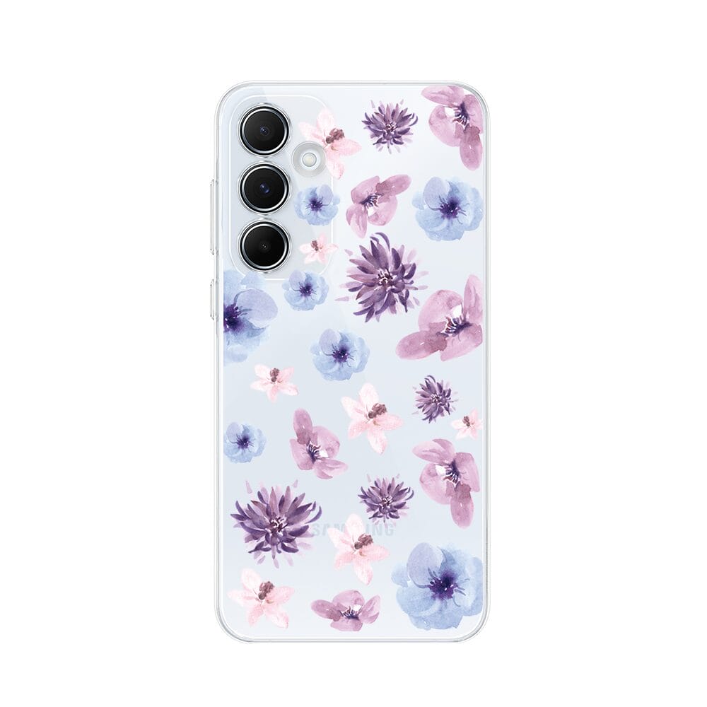 Etui do Samsung Galaxy A35 5G przeźroczyste, silikonowe Flexi, kwiatki niebieskie, fioletowe