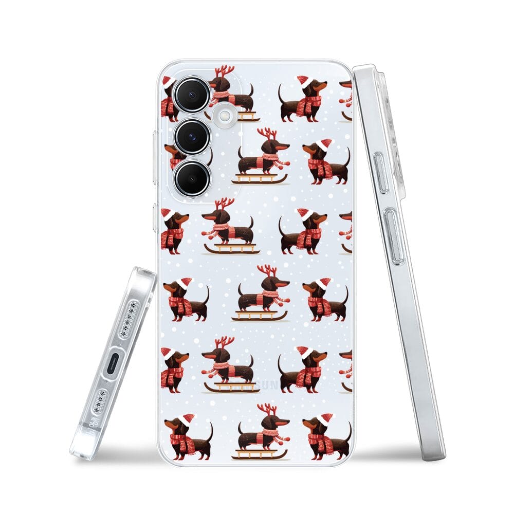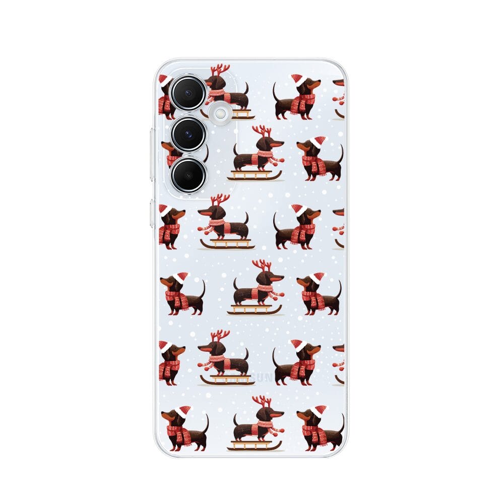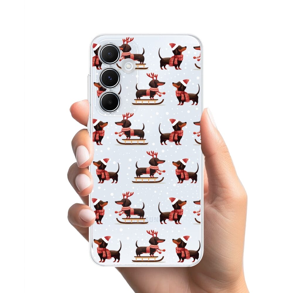 Etui do Samsung Galaxy A35 5G przeźroczyste, silikonowe Flexi, Przytulne święta, Jamniki na saniach