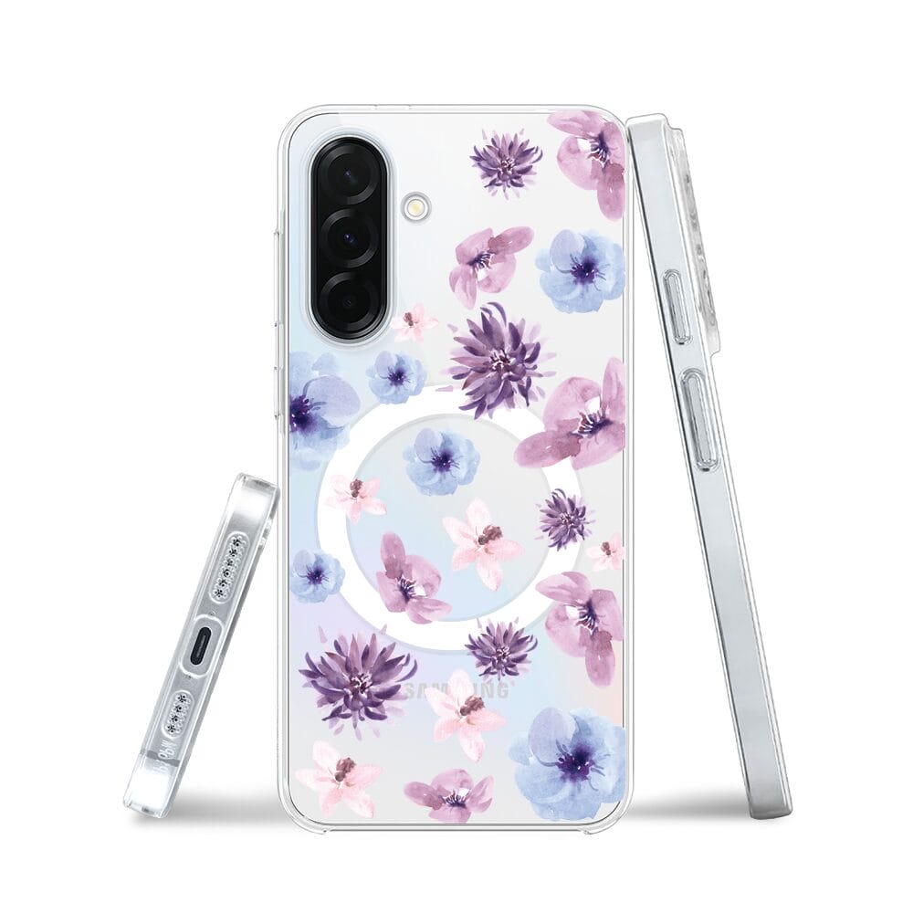 Etui do Samsung Galaxy A36 5G z MagSafe przeźroczyste, silikonowe Flexi, kwiatki niebieskie, fioletowe