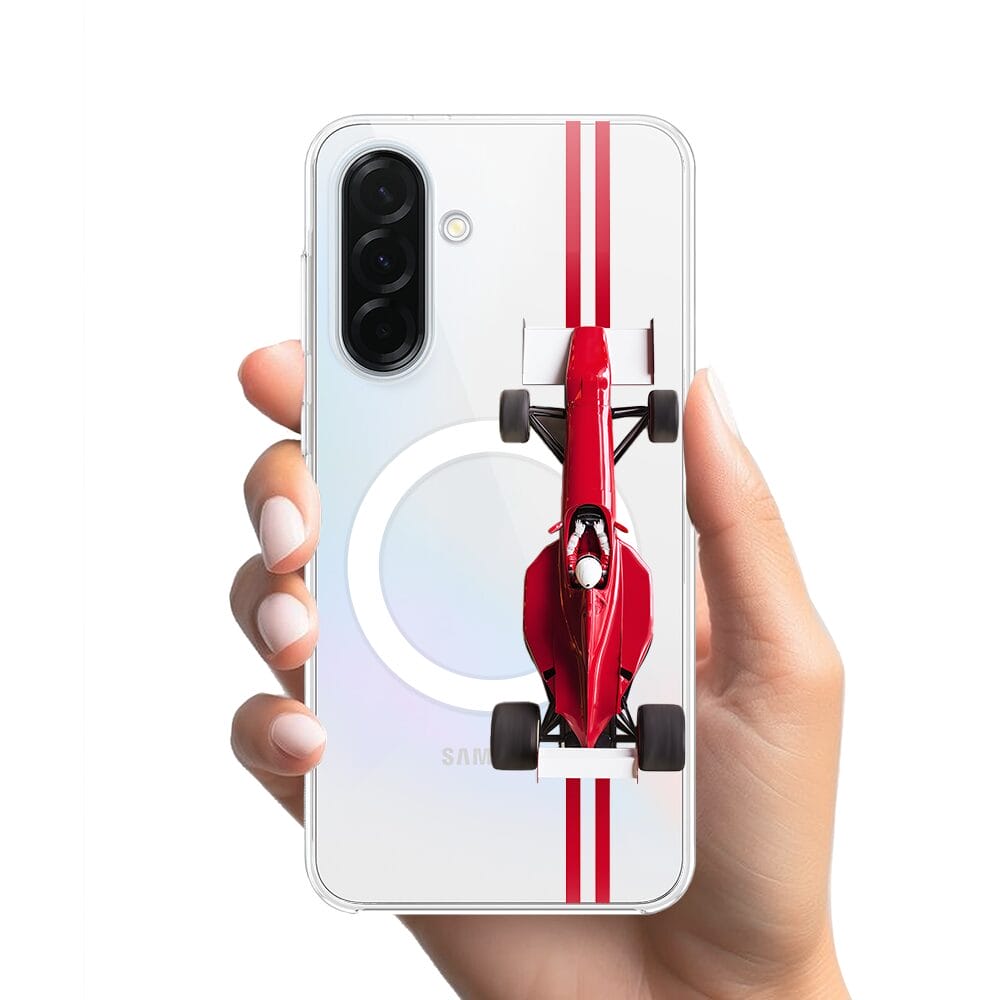 Etui do Samsung Galaxy A36 5G z MagSafe przeźroczyste, silikonowe Flexi, Szybkie Auta, czerwone F1