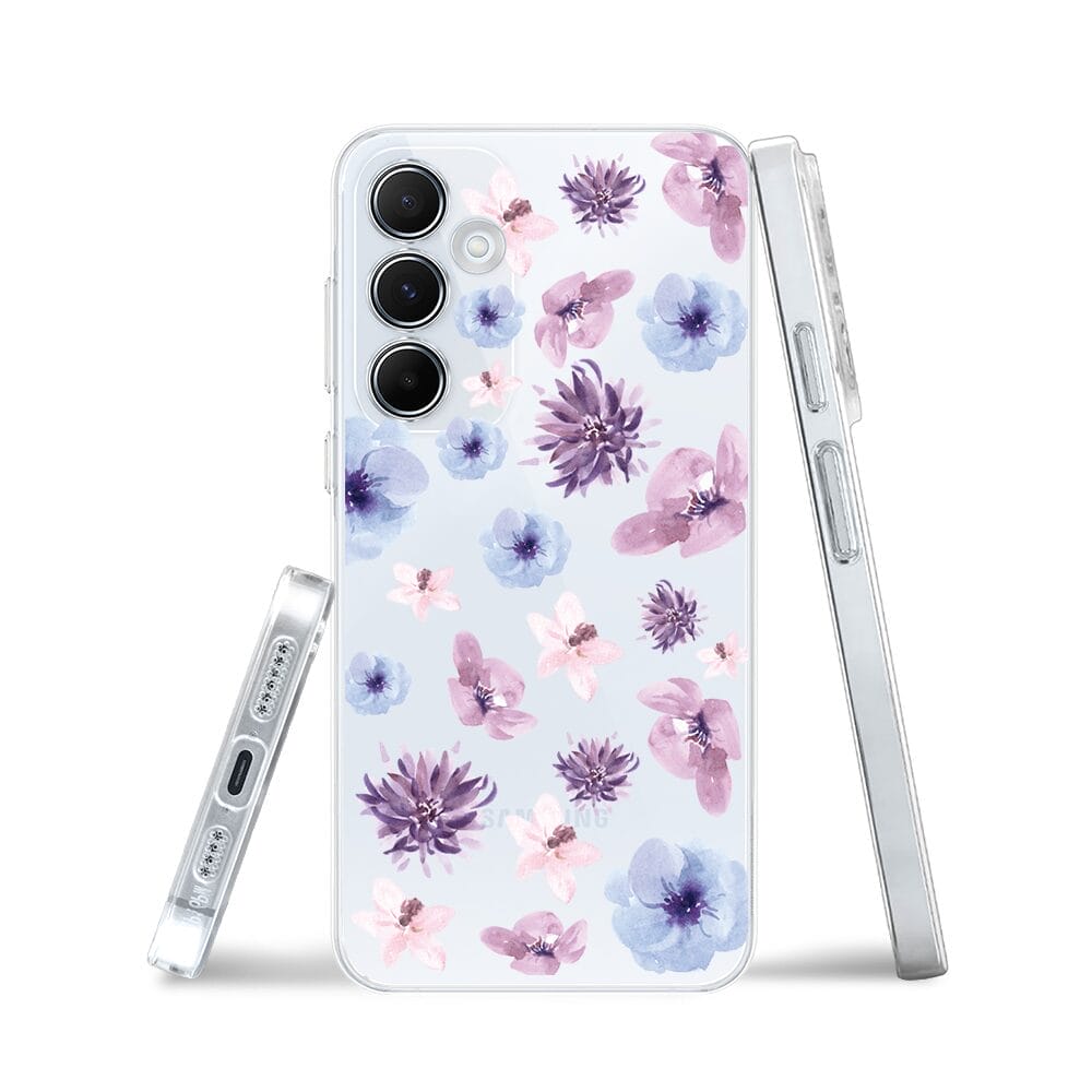 Etui do Samsung Galaxy A55 5G przeźroczyste, silikonowe Flexi, kwiatki niebieskie, fioletowe