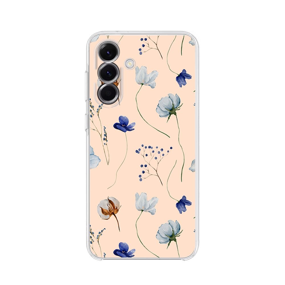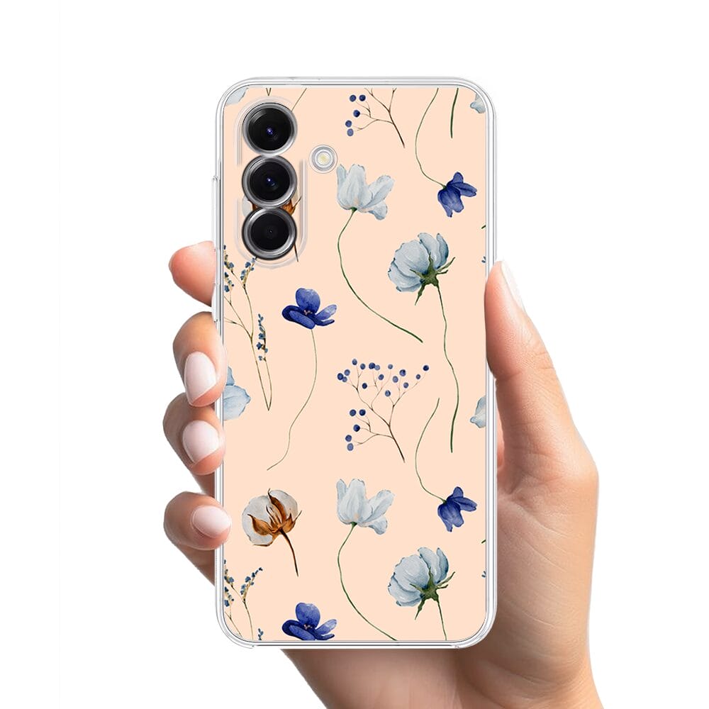 Etui do Samsung Galaxy A56 5G przeźroczyste, silikonowe Flexi, kwiatki niebieskie na pudrowym tle