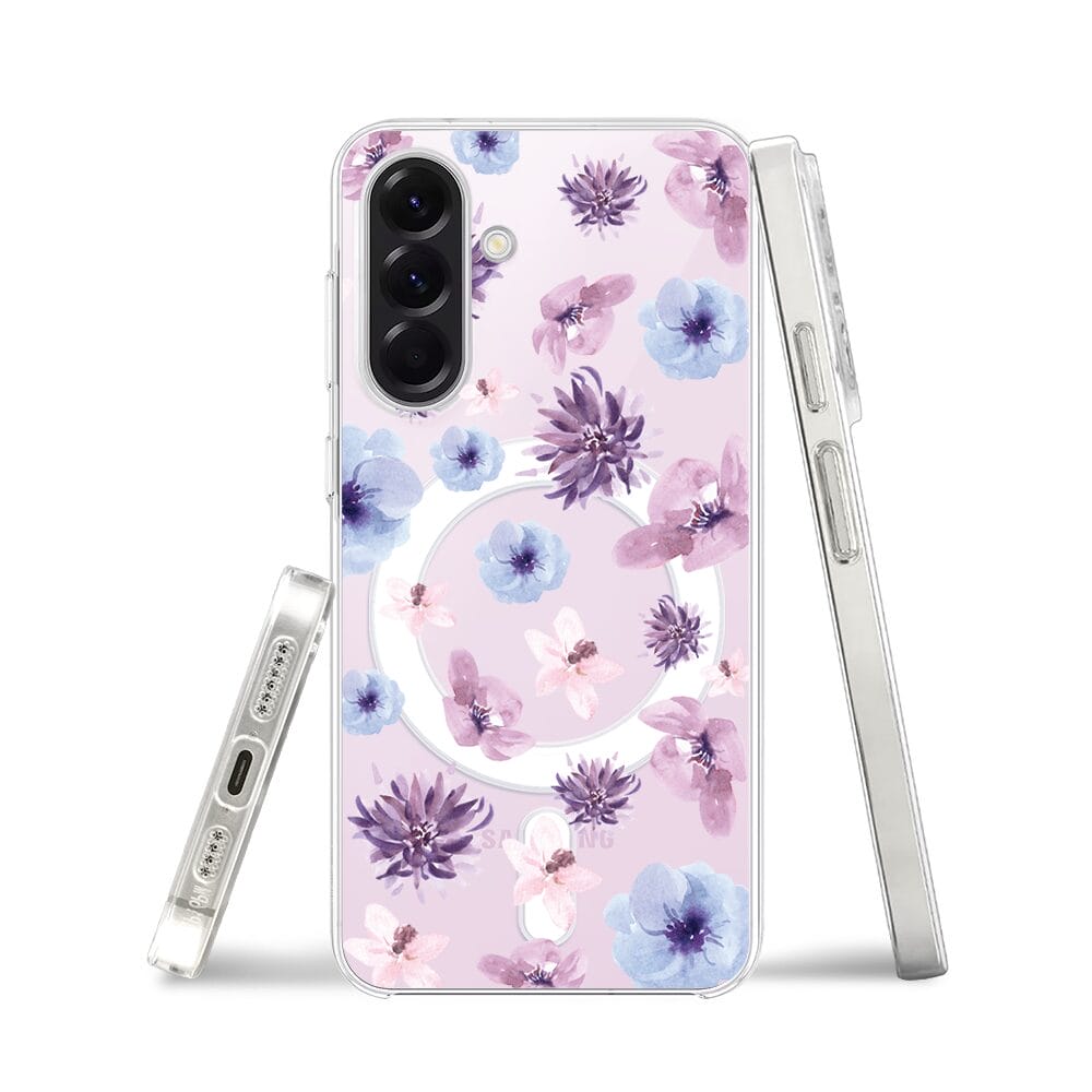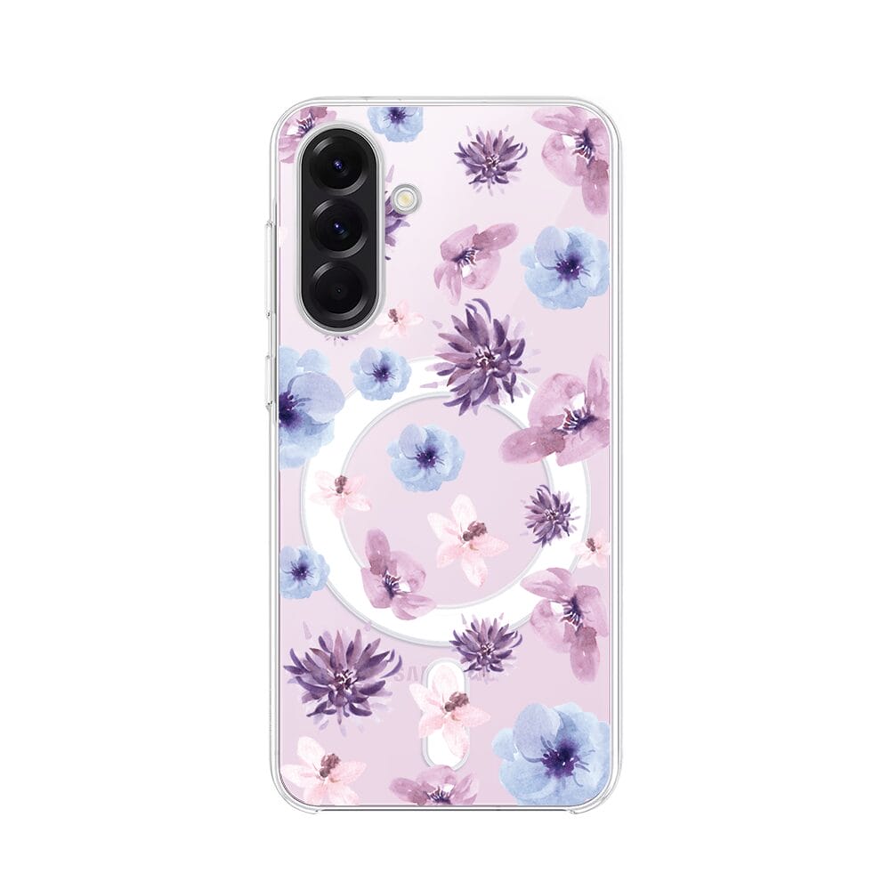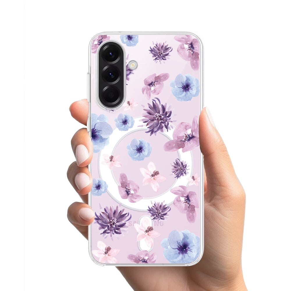 Etui do Samsung Galaxy A57 z MagSafe przeźroczyste, silikonowe Flexi, kwiatki niebieskie, fioletowe
