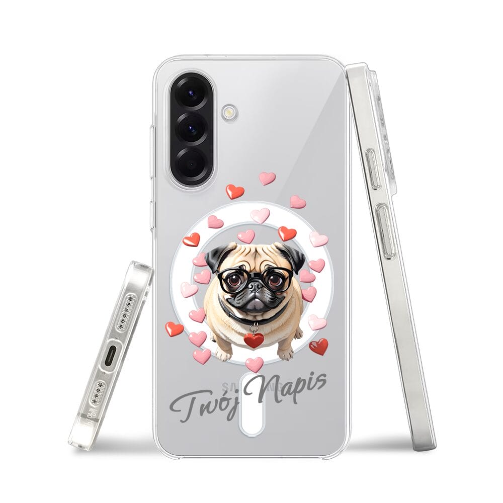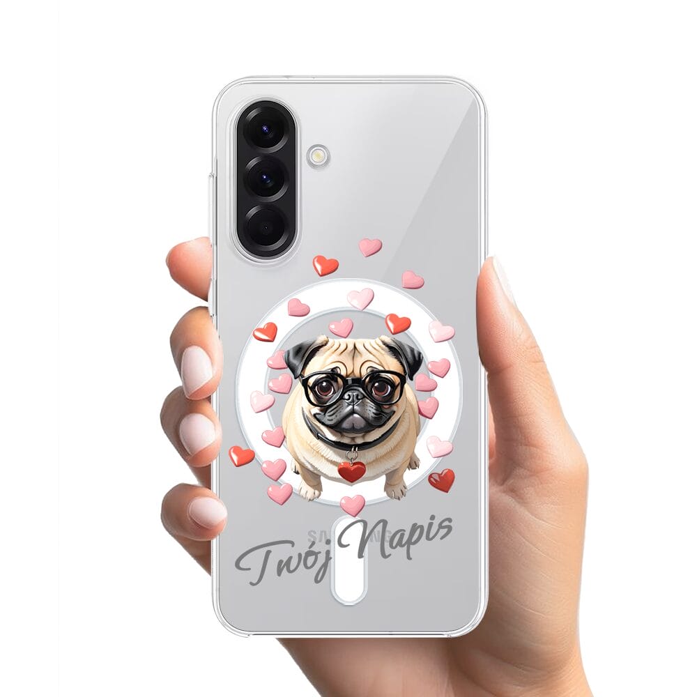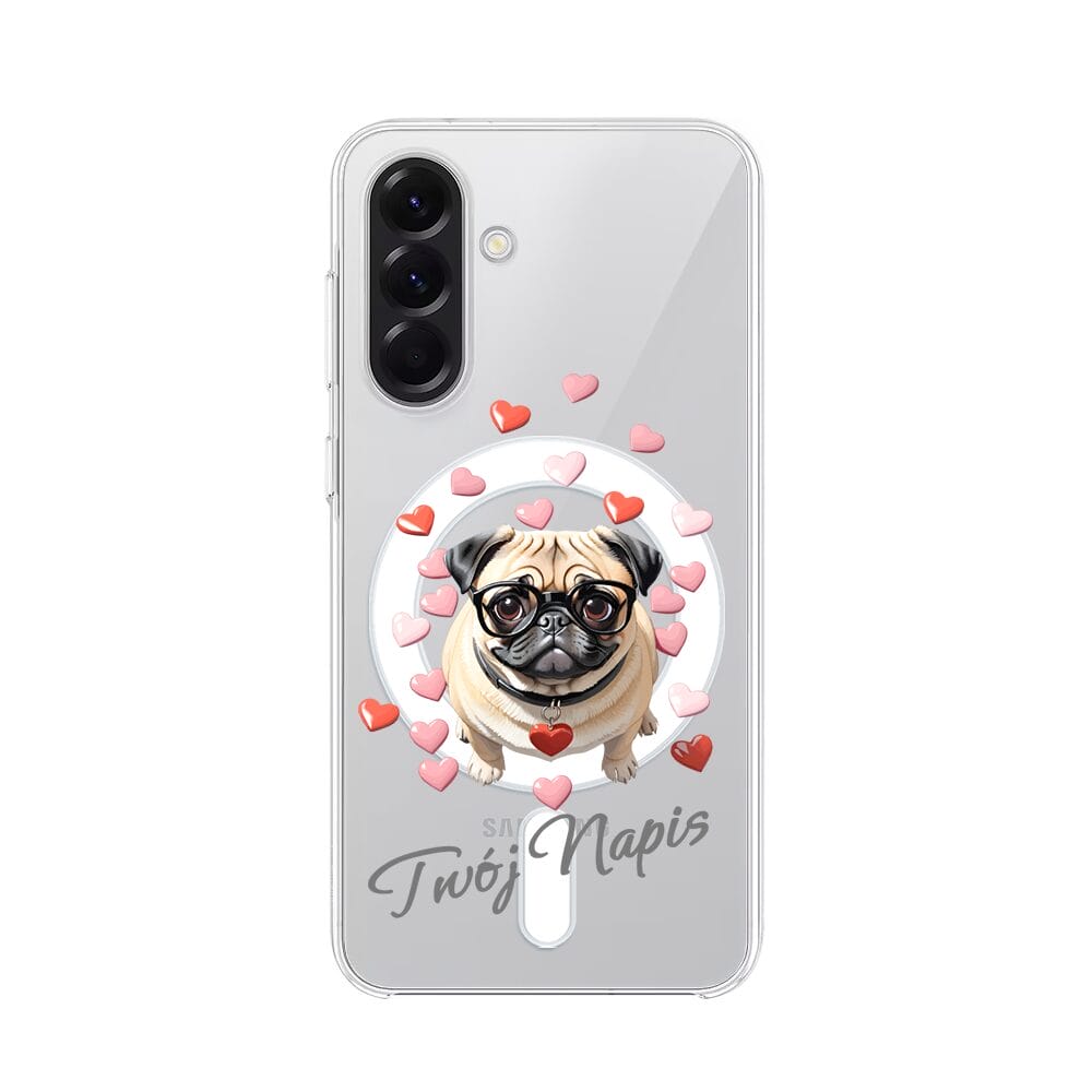 Etui do Samsung Galaxy A57 z MagSafe przeźroczyste, silikonowe Flexi, Puppy Love, pies rasy Mops