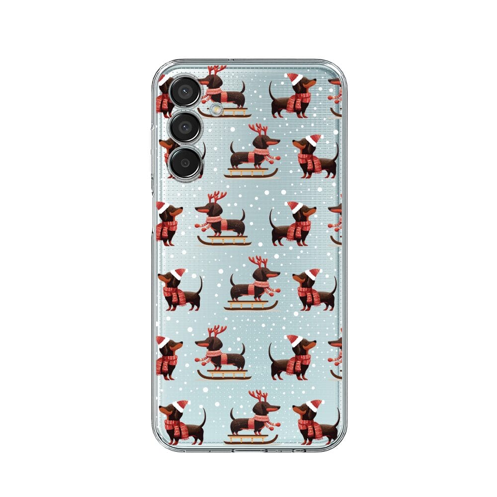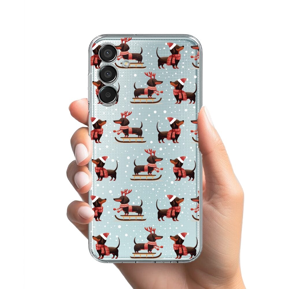 Etui do Samsung Galaxy M15 5G przeźroczyste, silikonowe Flexi, Przytulne święta, Jamniki na saniach