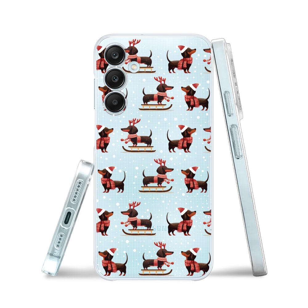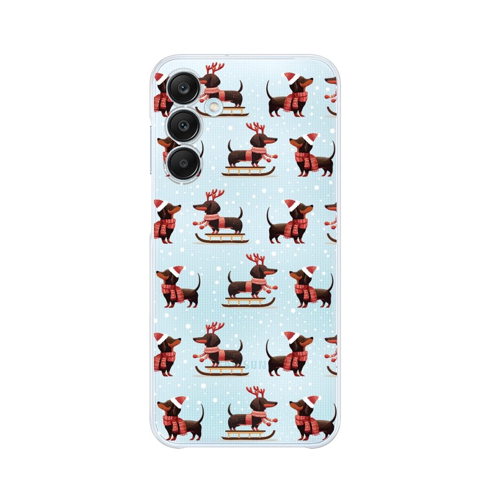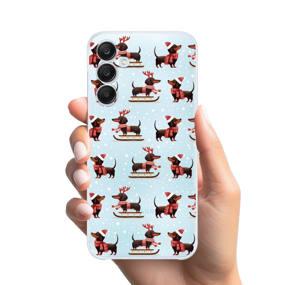 Etui do Samsung Galaxy M35 5G przeźroczyste, silikonowe Flexi, Przytulne święta, Jamniki na saniach