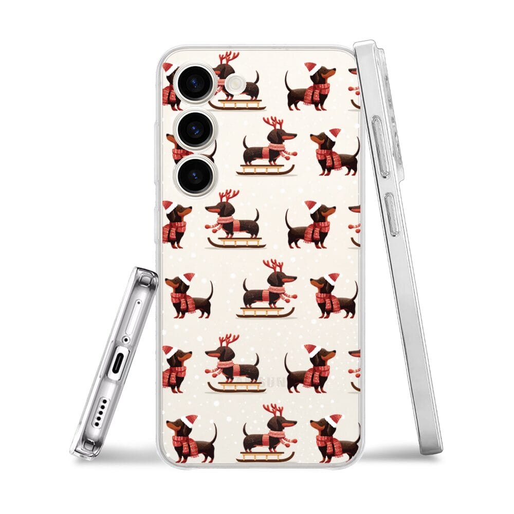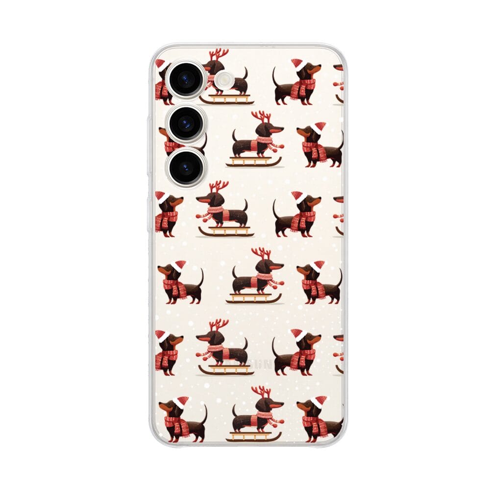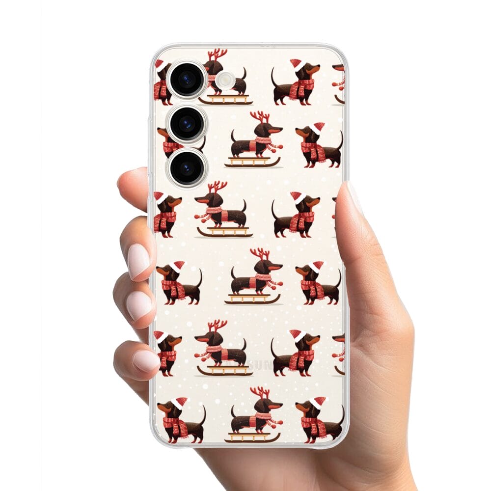 Etui do Samsung Galaxy S23 FE 5G przeźroczyste, silikonowe Flexi, Przytulne święta, Jamniki na saniach