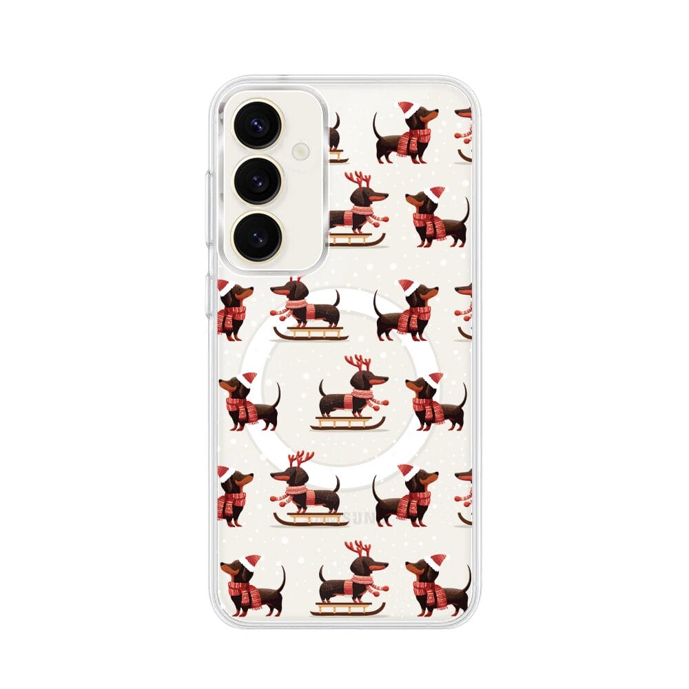 Etui do Samsung Galaxy S23 FE 5G z MagSafe przeźroczyste, silikonowe Flexi, Przytulne święta, Jamniki na saniach