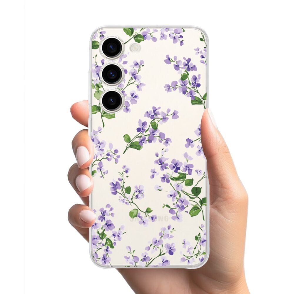 Etui do Samsung Galaxy S23 Plus przeźroczyste, silikonowe Flexi, Fioletowe Bratki