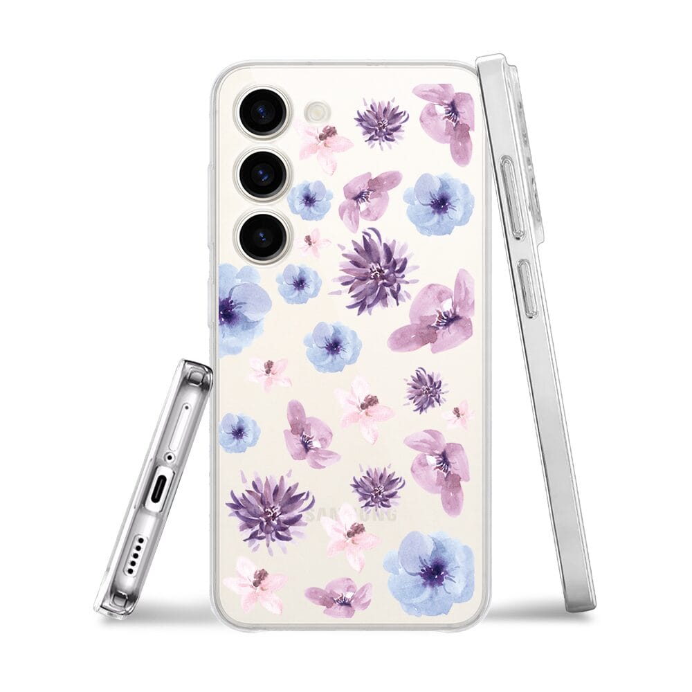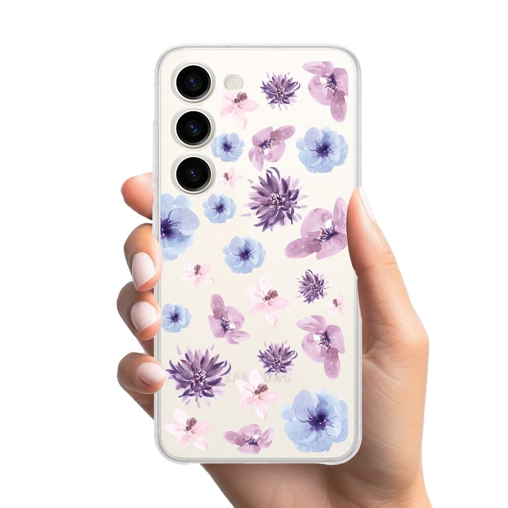 Etui do Samsung Galaxy S23 Plus przeźroczyste, silikonowe Flexi, kwiatki niebieskie, fioletowe