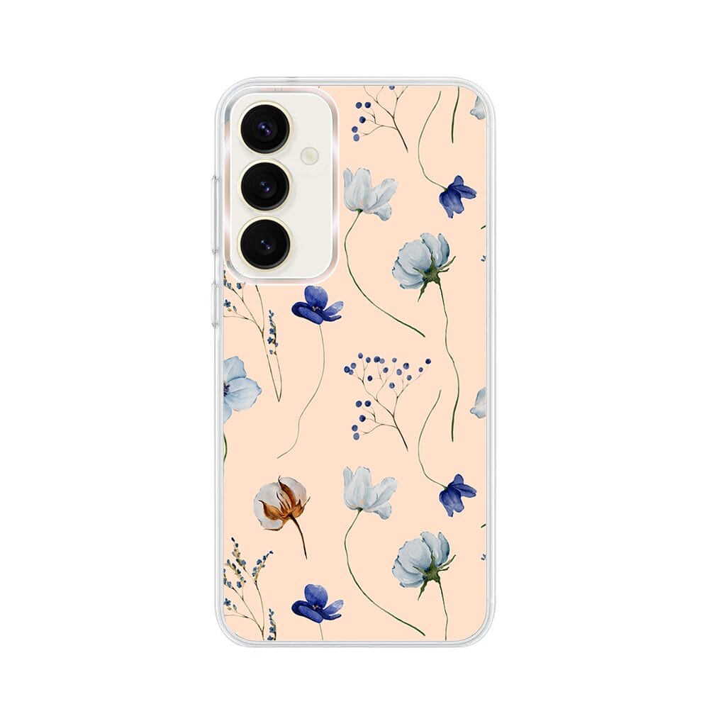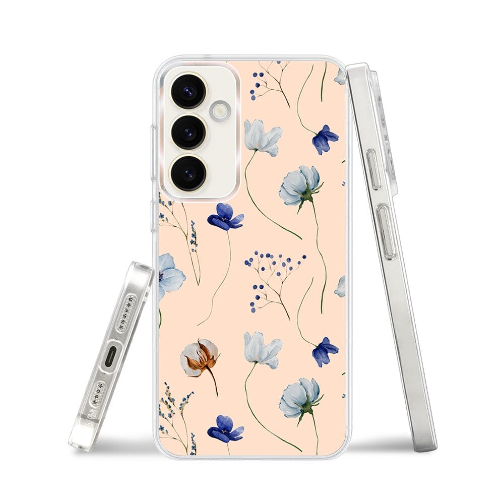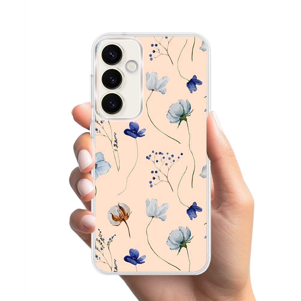 Etui do Samsung Galaxy S23 Plus z MagSafe przeźroczyste, silikonowe Flexi, kwiatki niebieskie na pudrowym tle