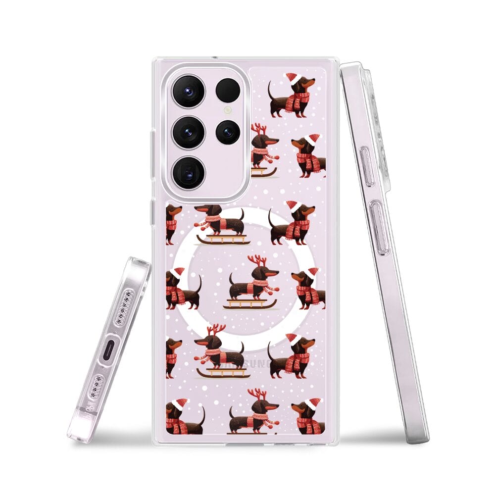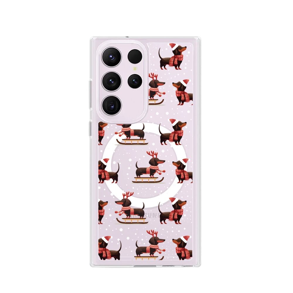 Etui do Samsung Galaxy S23 Ultra z MagSafe przeźroczyste, silikonowe Flexi, Przytulne święta, Jamniki na saniach