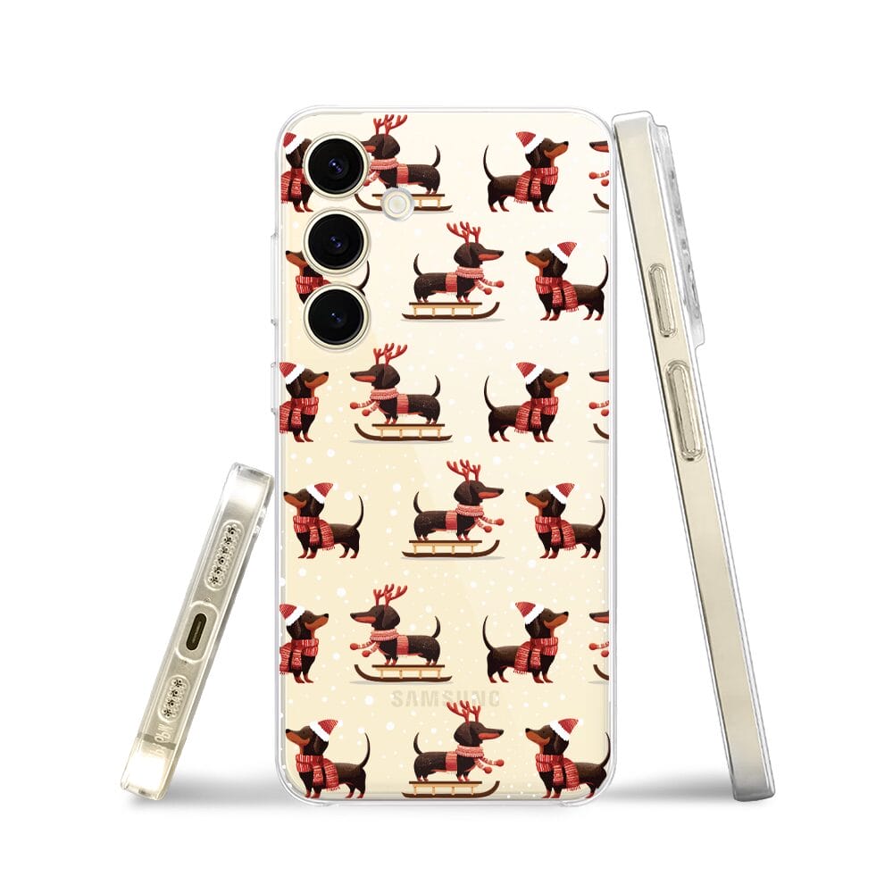Etui do Samsung Galaxy S24 Plus przeźroczyste, silikonowe Flexi, Przytulne święta, Jamniki na saniach