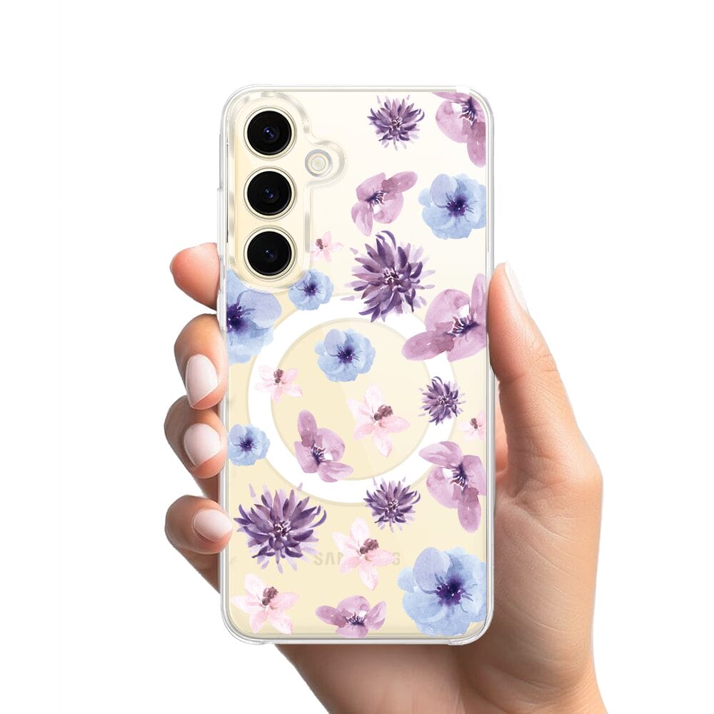 Etui do Samsung Galaxy S24 Plus z MagSafe przeźroczyste, silikonowe Flexi, kwiatki niebieskie, fioletowe