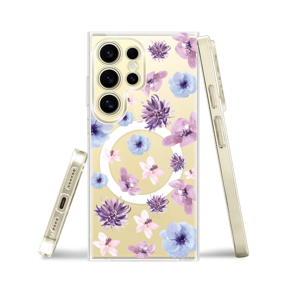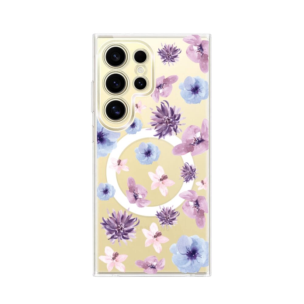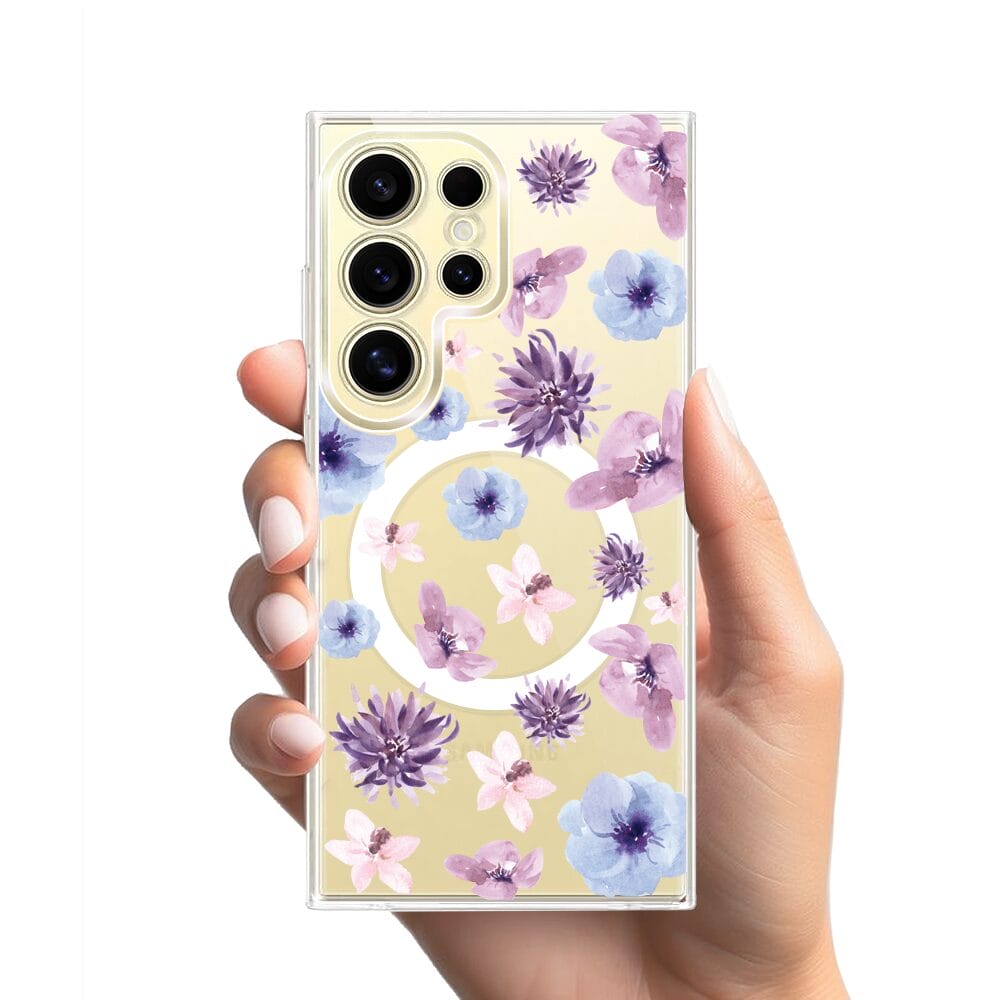 Etui do Samsung Galaxy S24 Ultra z MagSafe przeźroczyste, silikonowe Flexi, kwiatki niebieskie, fioletowe