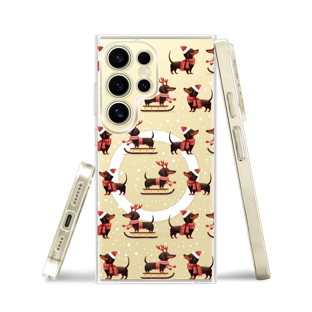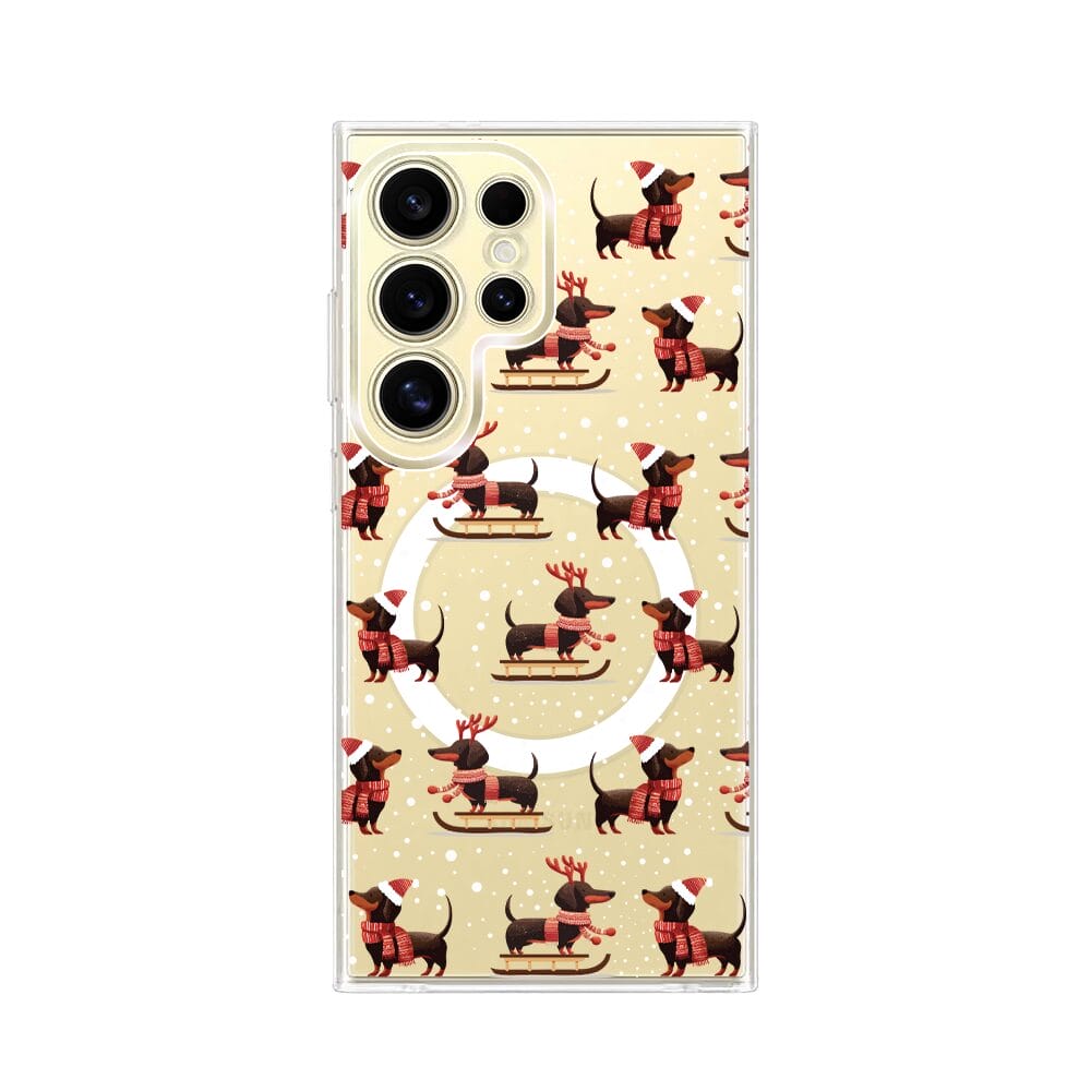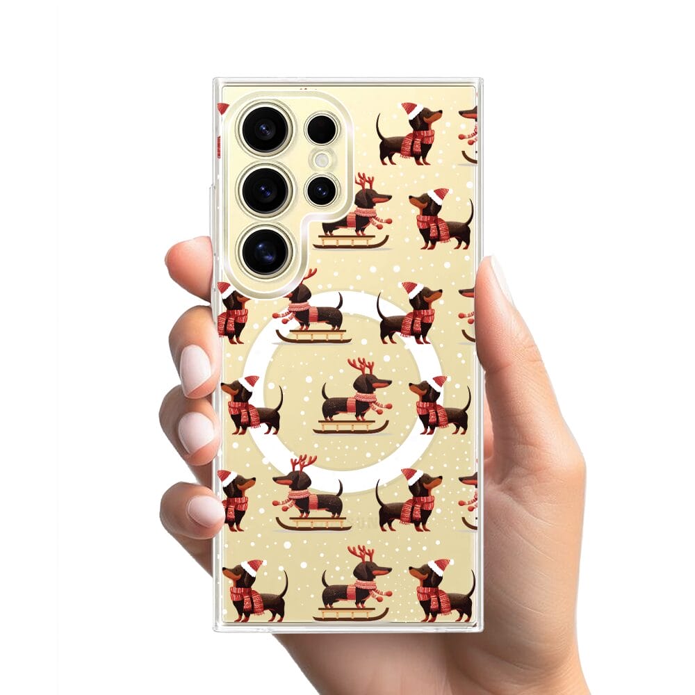 Etui do Samsung Galaxy S24 Ultra z MagSafe przeźroczyste, silikonowe Flexi, Przytulne święta, Jamniki na saniach
