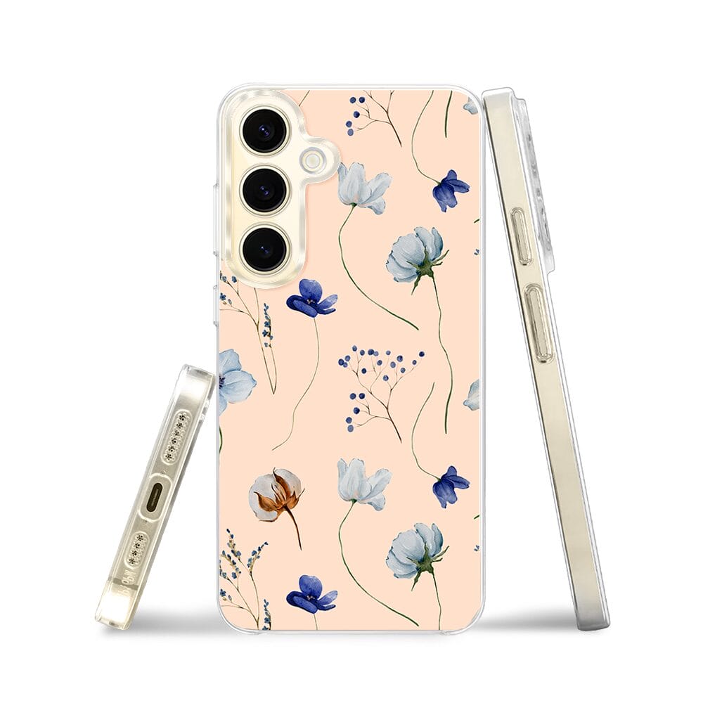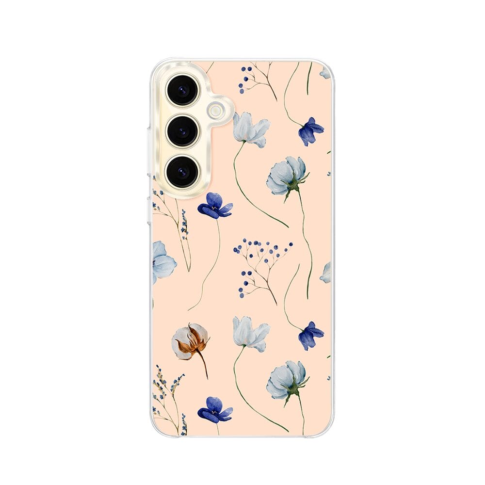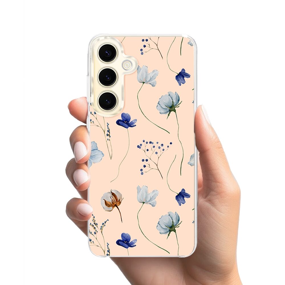 Etui do Samsung Galaxy S24 z MagSafe przeźroczyste, silikonowe Flexi, kwiatki niebieskie na pudrowym tle