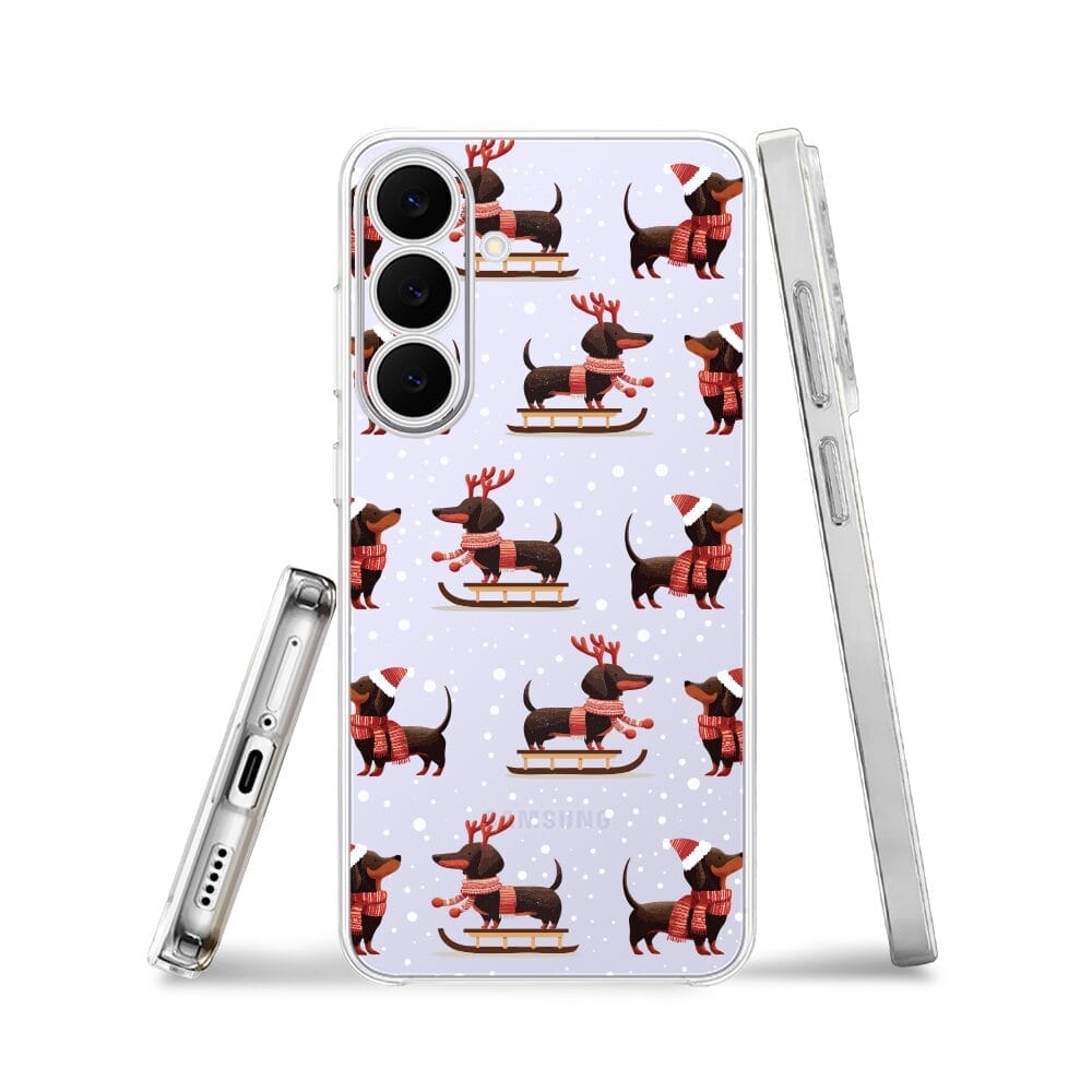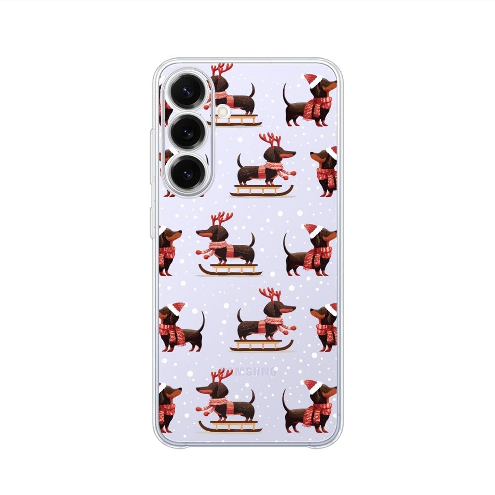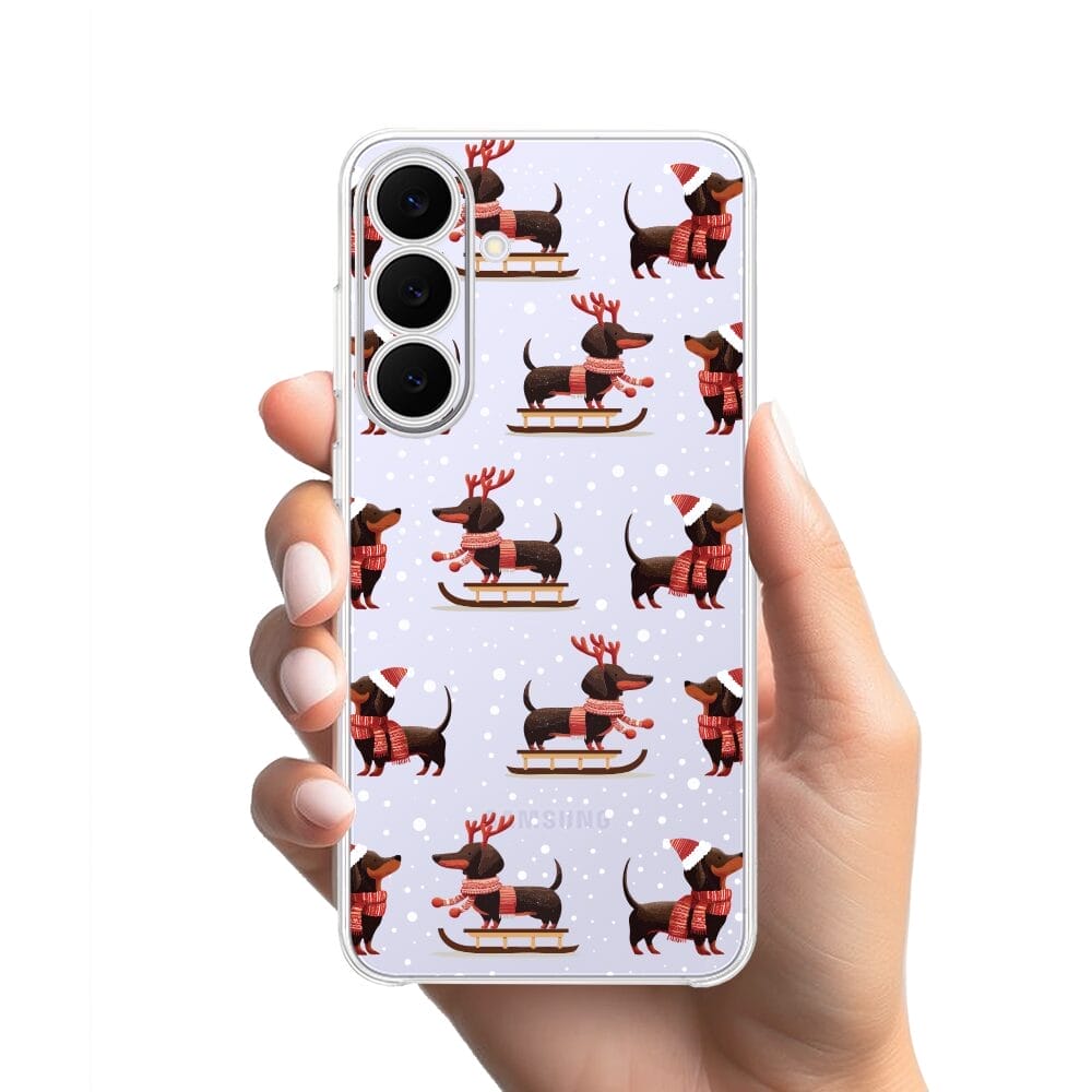 Etui do Samsung Galaxy S25 FE przeźroczyste, silikonowe Flexi, Przytulne święta, Jamniki na saniach