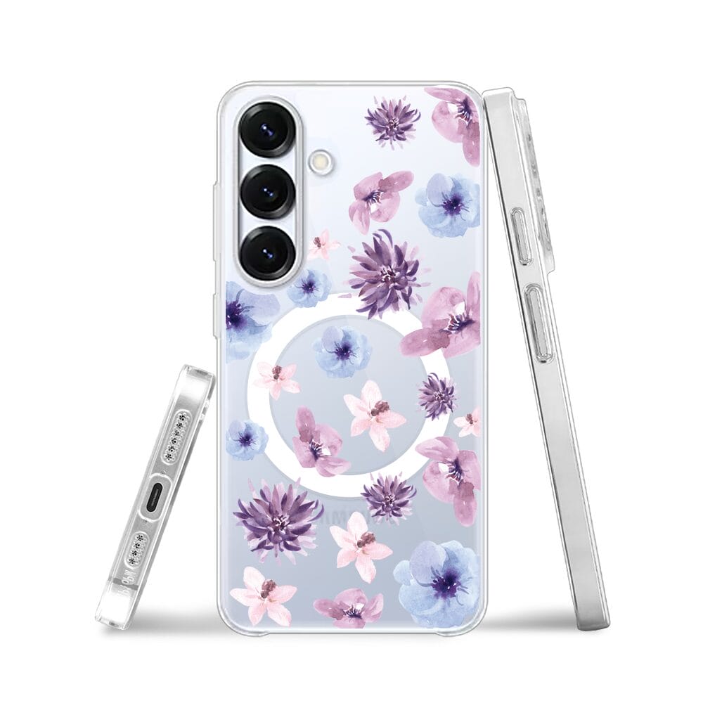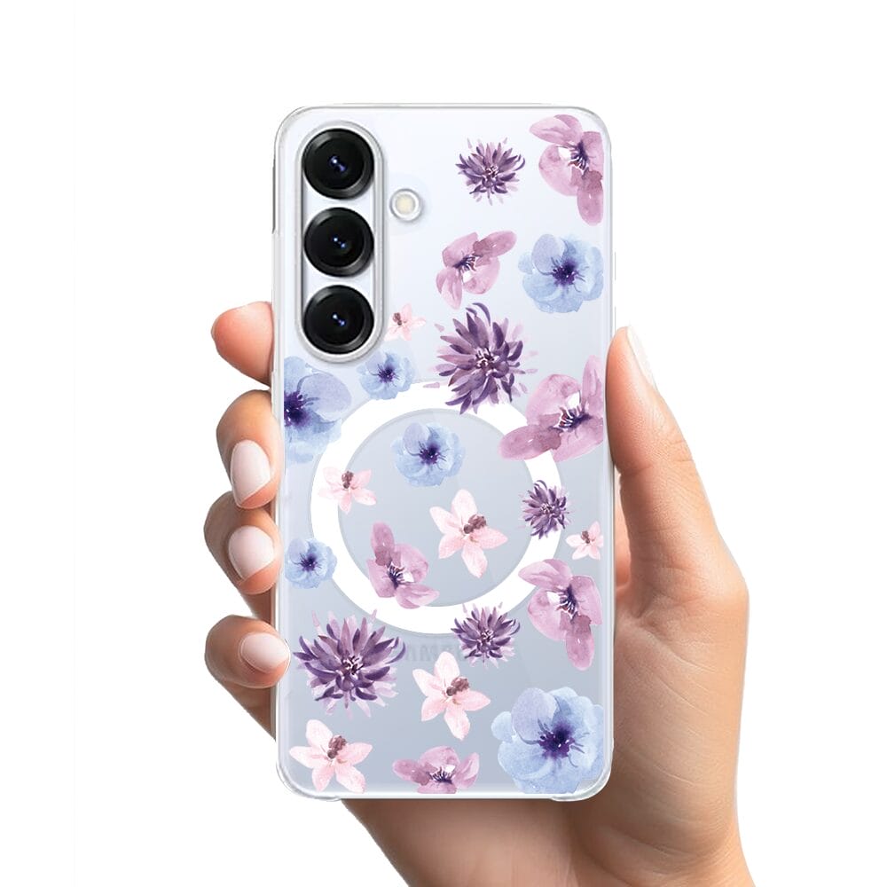 Etui do Samsung Galaxy S25 Plus z MagSafe przeźroczyste, silikonowe Flexi, kwiatki niebieskie, fioletowe