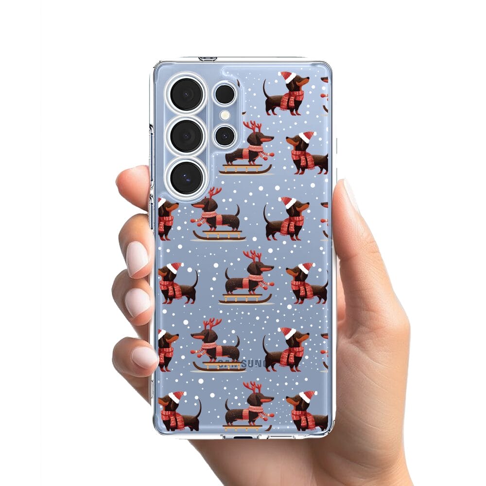 Etui do Samsung Galaxy S25 Ultra przeźroczyste, silikonowe Flexi, Przytulne święta, Jamniki na saniach