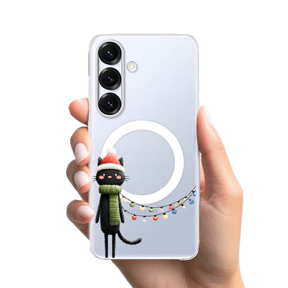 Etui do Samsung Galaxy S25 z MagSafe przeźroczyste, silikonowe Flexi, Przytulne święta, Kot przebrany za elfa
