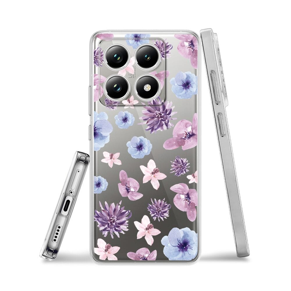 Etui do Xiaomi 14T Pro przeźroczyste, silikonowe Flexi, kwiatki niebieskie, fioletowe