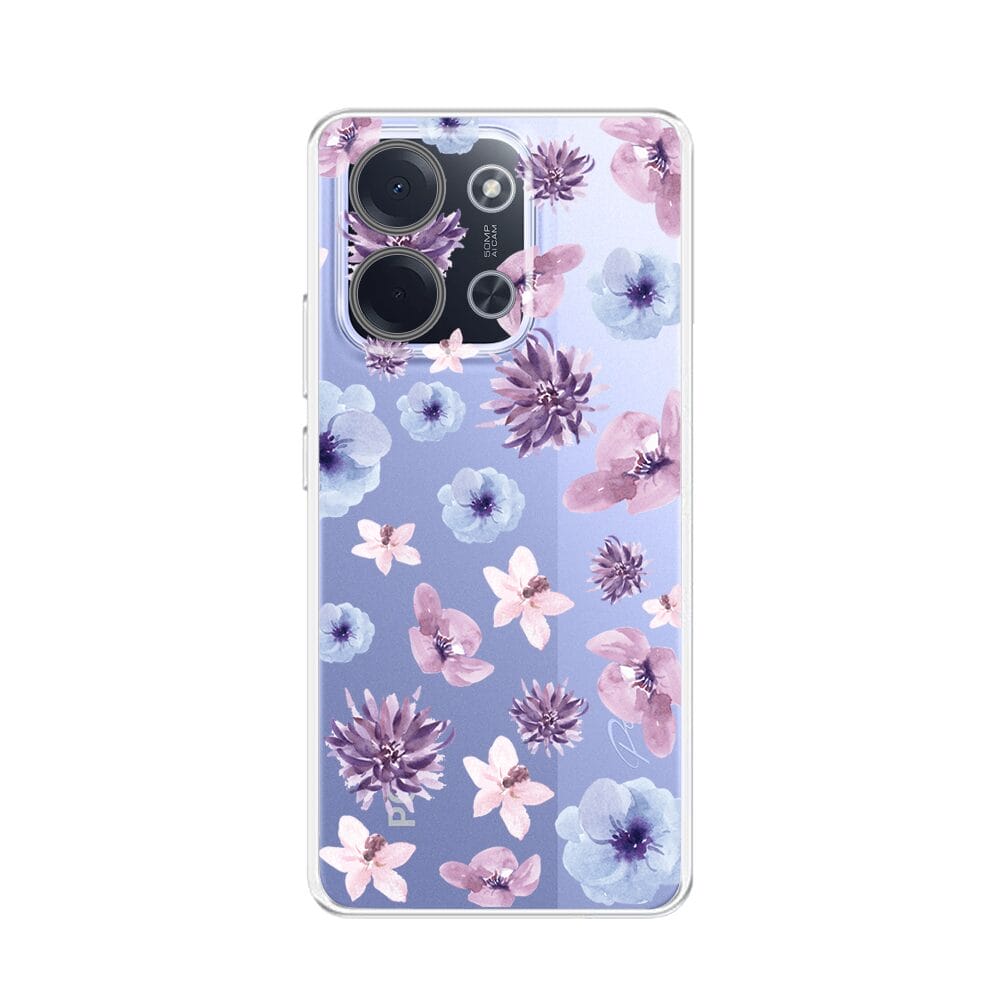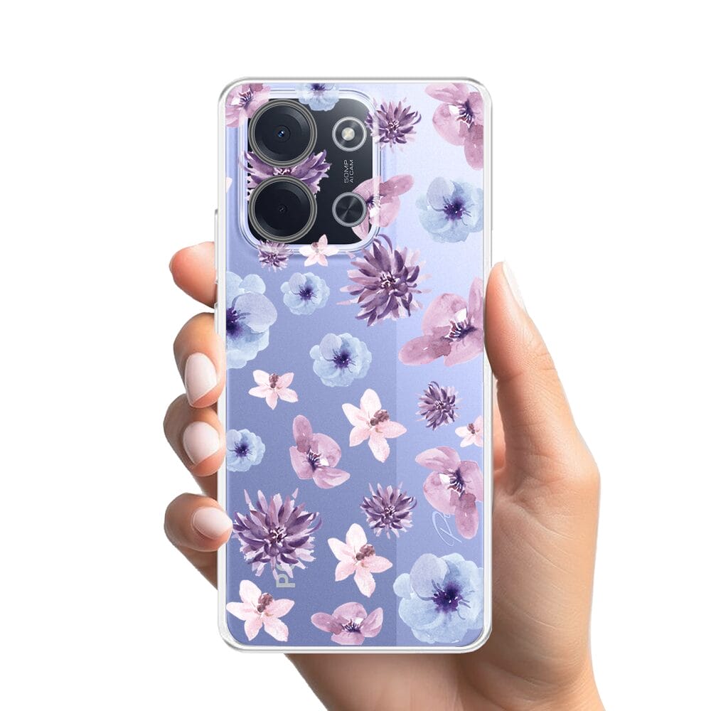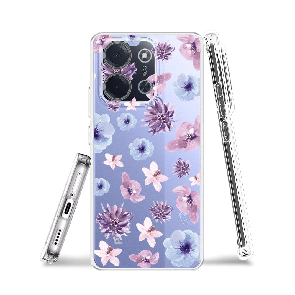 Etui do Xiaomi POCO C85 przeźroczyste, silikonowe Flexi, kwiatki niebieskie, fioletowe