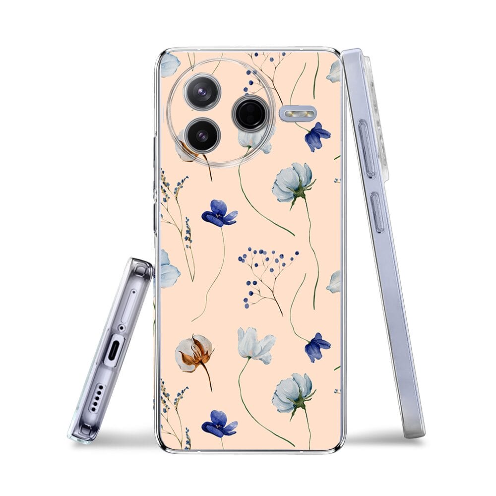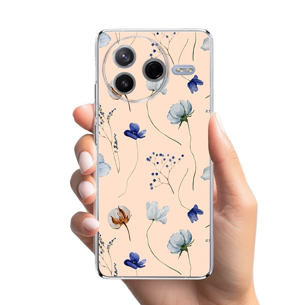 Etui do Xiaomi POCO F7 Pro przeźroczyste, silikonowe Flexi, kwiatki niebieskie na pudrowym tle