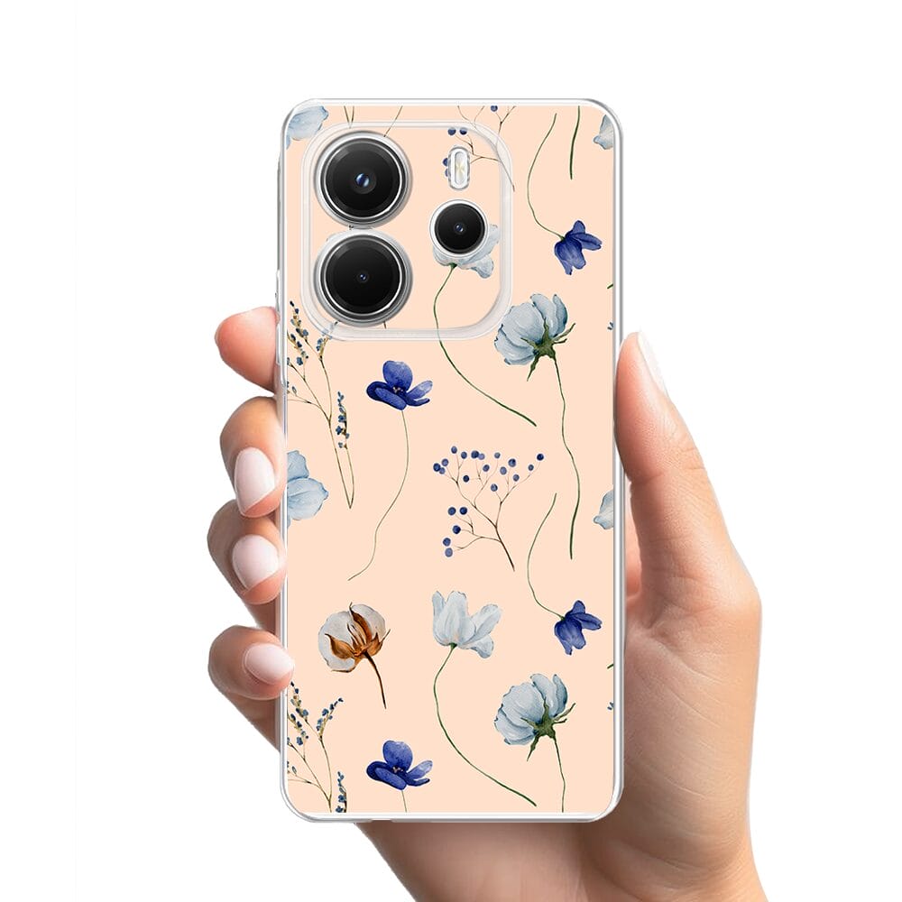 Etui do Xiaomi Redmi Note 14 4G przeźroczyste, silikonowe Flexi, kwiatki niebieskie na pudrowym tle