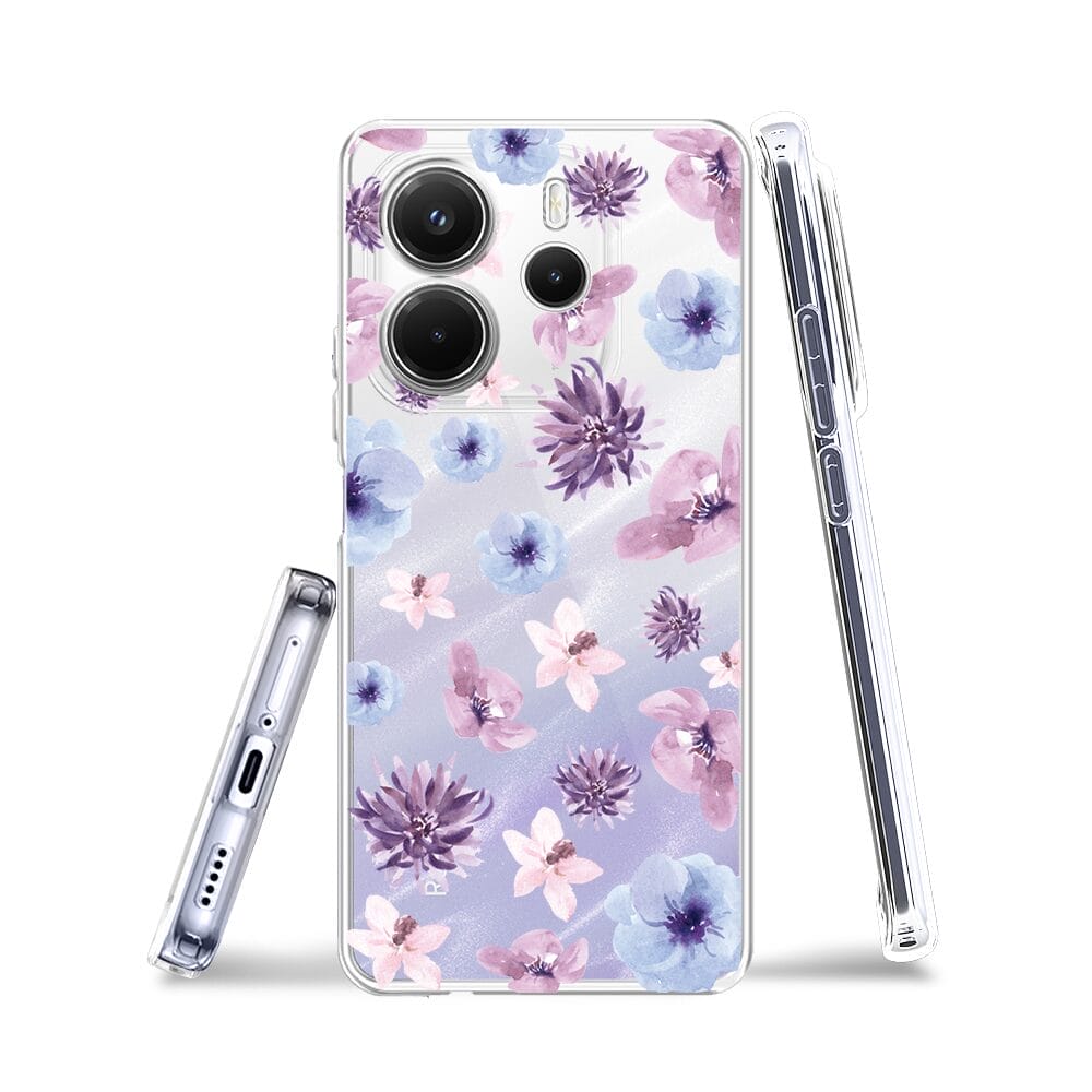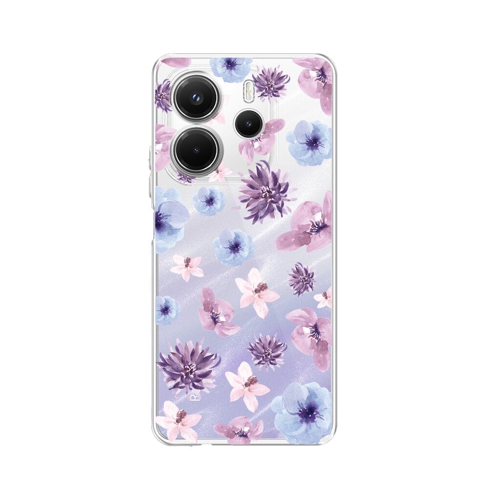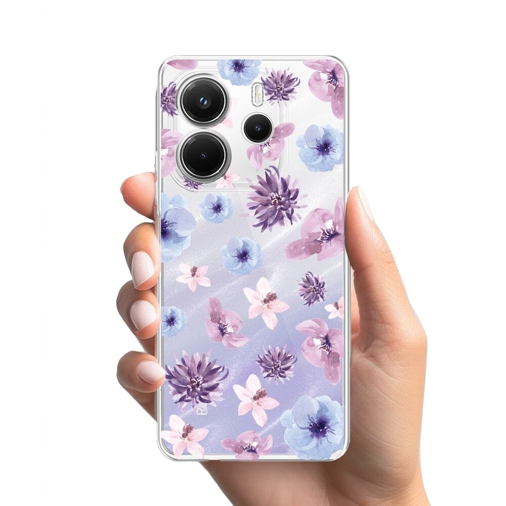 Etui do Xiaomi Redmi Note 14 5G przeźroczyste, silikonowe Flexi, kwiatki niebieskie, fioletowe